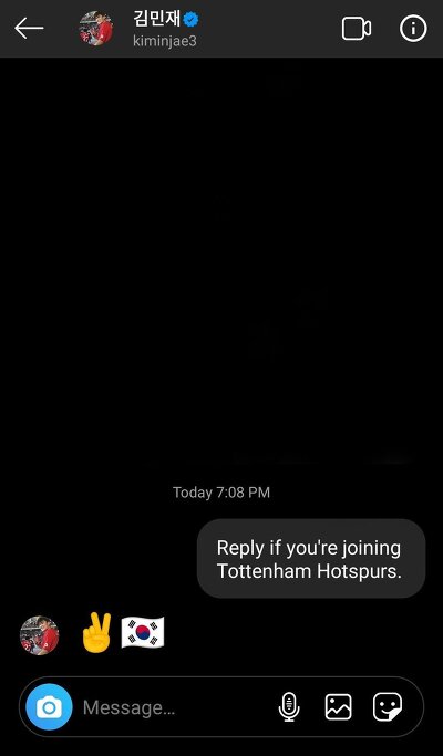 현재 해외 토트넘 팬이 김민재에게 받은 인스타 Dm이 화제중인데요! 저 브이와 태극기는 어떤 의미일까요??? 2명의 코리안??????????