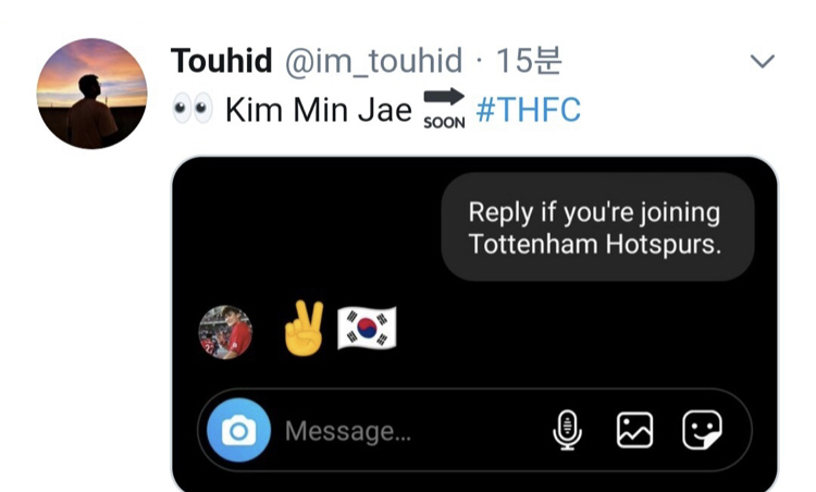 | 현재 굉장히 의미심장한 토트넘팬이 김민재한테 DM 보낸후 답장 | |
