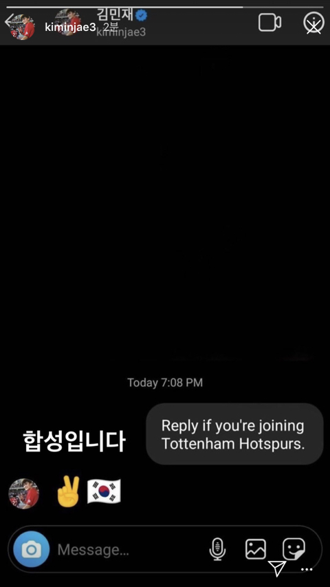 토트넘 팬 : 만약 토트넘 오는거면 답장해줘!! 김민재 : ✌️