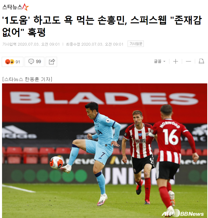 [현지 팬들 "손흥민 존재감 없어" 혹평 중]