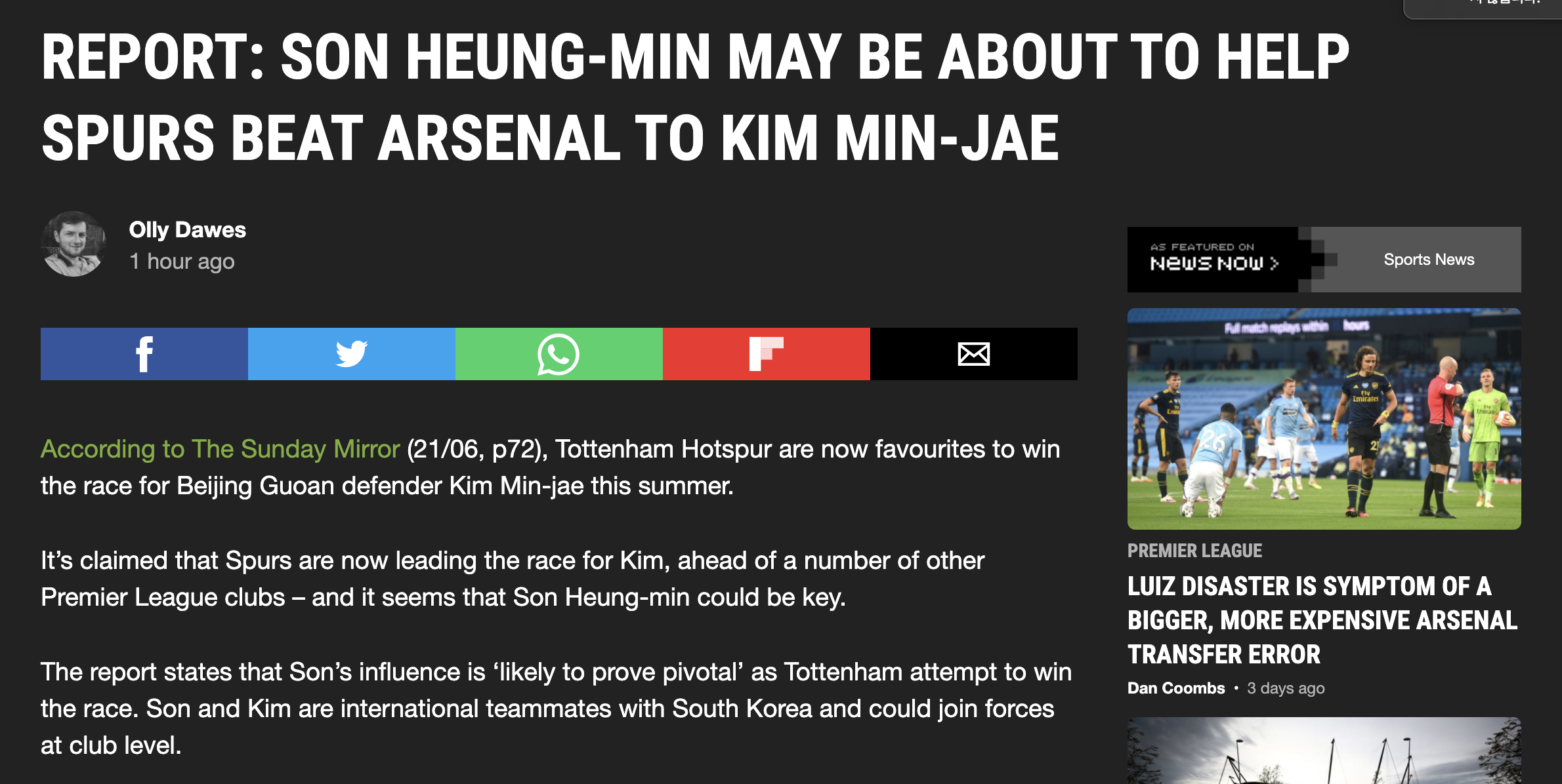 출처 : https://www.hitc.com/en-gb/2020/06/21/report-son-heung-min-may-be-about-to-help-spurs-beat-arsenal-to-kim-min-jae/