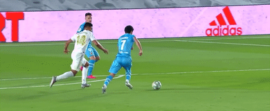 그리고 아센시오의 진행방향에 맞춰 역습 속도를 살린 '크로스의 전환패스'