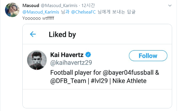 한 첼시 팬이 "첼시, 이제 하베르츠도 어서 오피셜 내줘!!" 라고 쓴 댓글에 좋아요를 누른 카이 하베르츠 (확인해보니 진짜 하베르츠의 찐계정 ㄷㄷㄷㄷ)