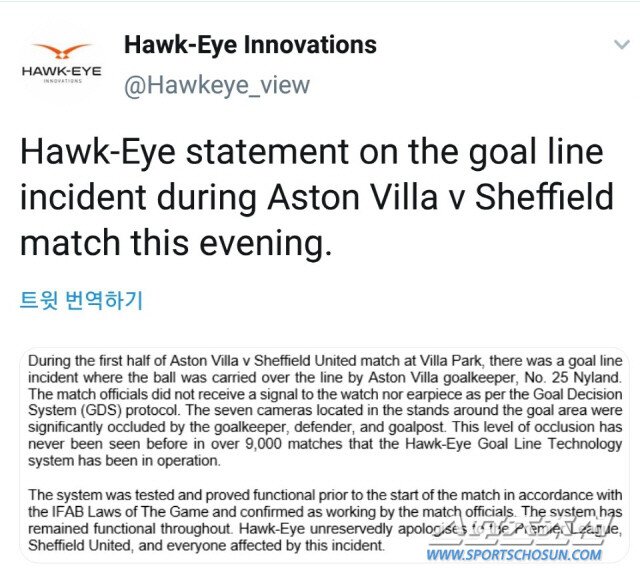 "이런 일은 호크아이 시스템을 작동한 지난 9000번의 경기에서 단 한번도 나온 적이 없는 일이다. 시스템이 제대로 작동되지 못한 점에 대해 프리미어리그, 셰필드 유나이티드, 그리고 이 사건과 관련된 모든 분들께 사과드린다"