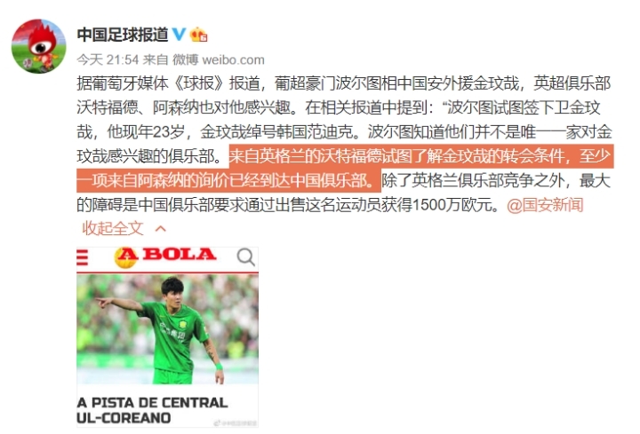 -6월 14일 21시 54분, 잉글랜드 왓포드는 김민재의 이적조건을 알아내려했고 적어도 아스널의 문의는 베이징에 왔음