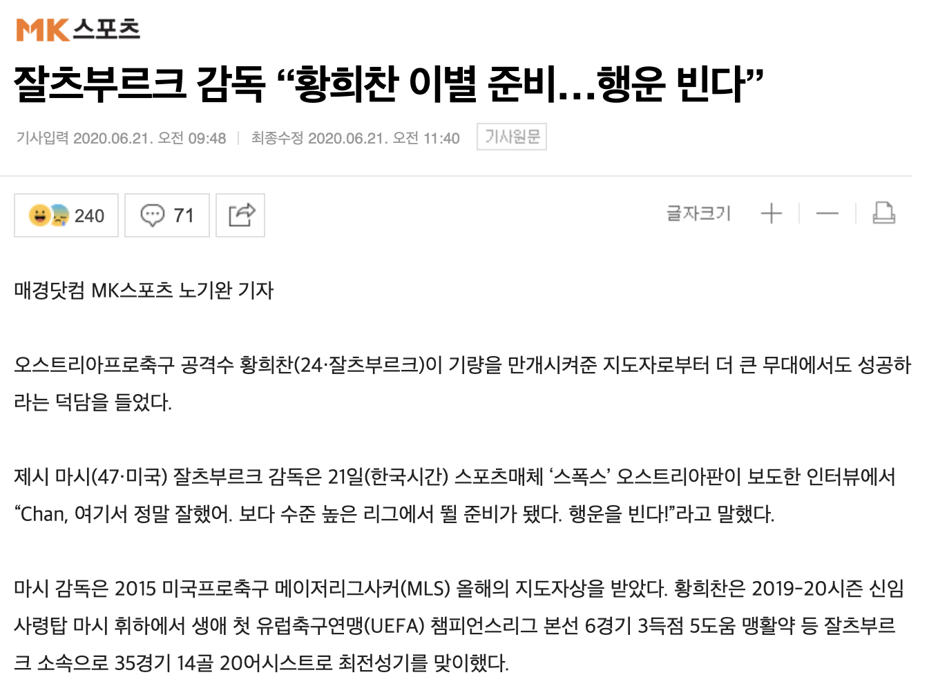 ["과연 행선지는 어디일까?", 황희찬에게 미리 작별 인사한 잘츠부르크 감독]