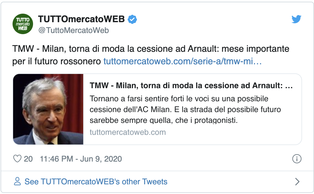 -TMW에 의하면 엘리엇(현 밀란 소유)과 버나드 아놀트(루이비통 창업자)의 AC밀란 인수 협상이 재점화 되었습니다.