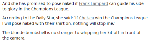 "첼시가 우승한다면, 유니폼과 함께 누드 사진을 공개하겠다. 아무것도 나를 막을 수 없을 것이다."