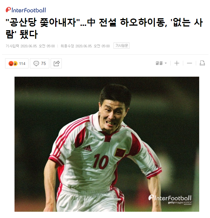 - A매치 115경기 출전, 총 41골로 중국 A매치 최다골 기록을 갖고 있는 중국의 축구 레전드 하오하이동 - 스페인에 거주 중인 하오하이동은 최근 중국 정부를 비판하는 영상을 유튜브에 올림 (요약 : 중국 공산당은 쫓겨나야한다) - 그 후 하오하이동의 모든 SNS 계정과 축구 선수로써의 기록까지 삭제됨 (최다 득점자 명단도 바뀜ㄷㄷ)
