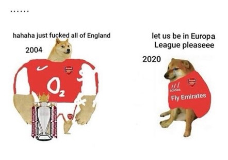 2004년 아스널 팬 : "하하하! 잉글랜드 모든 팀을 담궜다" 2020년 아스널 팬 : "유로파 리그라도 가자.."
