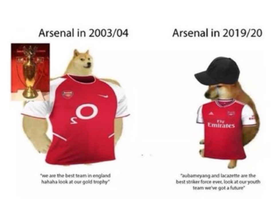 03/04 아스널 팬 : "우리는 잉글랜드 최고의 팀이다. 하하하! 우리의 무패 우승 골드 트로피를 봐라" 19/20 아스널 팬 : "오바메양, 라카제트는 최고의 공격수들입니다. 우리의 미래인 유스팀을 보십시요"