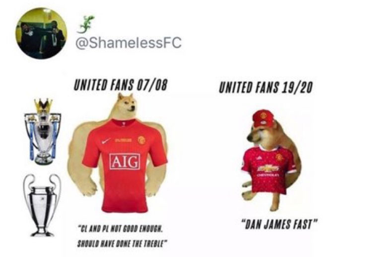 07/08 맨유 팬 : "챔스와 리그 우승은 부족하다. 트레블이 필요하다" 19/20 맨유 팬 : "우리의 다니엘 제임스는 빨라!"