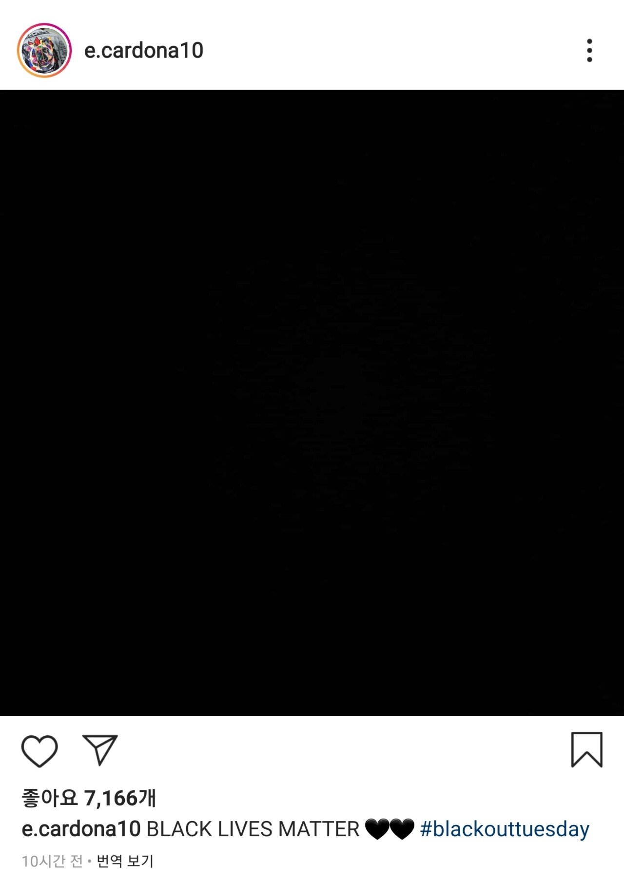 흑인 인종차별에 반대한다는 글을 올린 콜롬비아 축구 선수 카르도나. 그런데 카르도나는 2017년 한국과의 친선 경기에서 동양인을 인종차별하는 제스처를 해 비난을 받았던 인물..