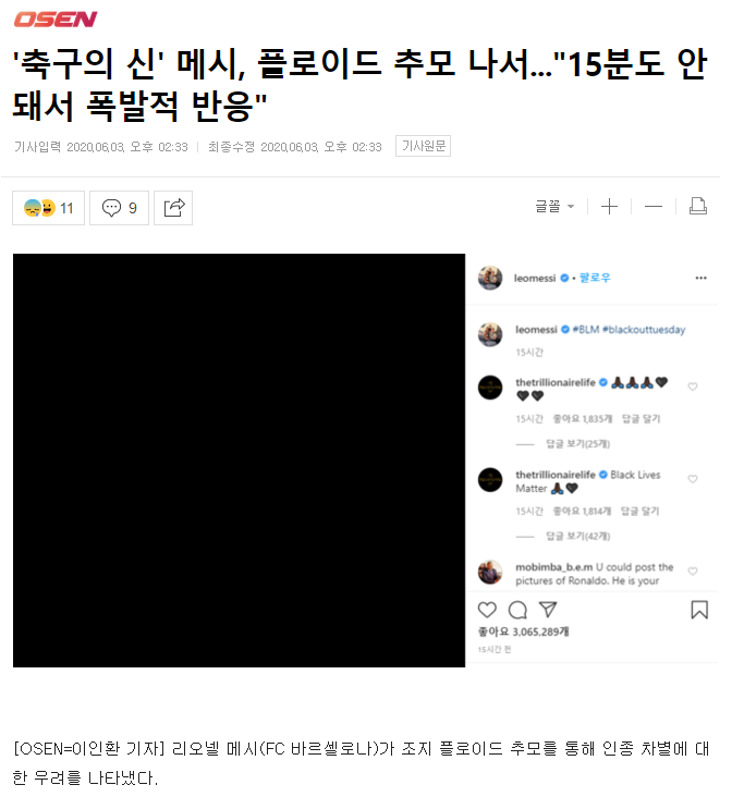 평소 축구 외 이슈에 대해서는 언급하지 않던 메시는 SNS에서 플로이드를 추모하기 위해 진행중인 '블랙 아웃' 캠페인에 동참했다.