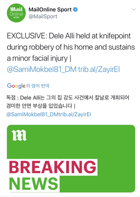 [델리 알리 집에 칼을 든 강도가 들었고 경미한 부상을 당함]