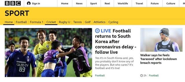 BBC 스포츠는 8일 전주월드컵경기장에서 열린 전북현대와 수원삼성의 K리그1(1부리그) 개막전을 실시간 생중계했다. 한국프로스포츠연맹에 따르면 BBC는 K리그 중계권을 구매한 36개국 언론사 중 하나다.