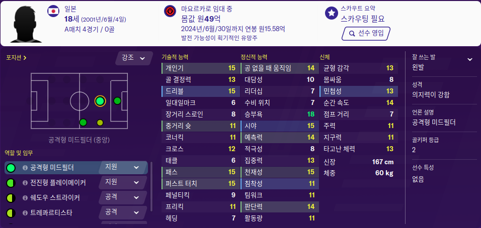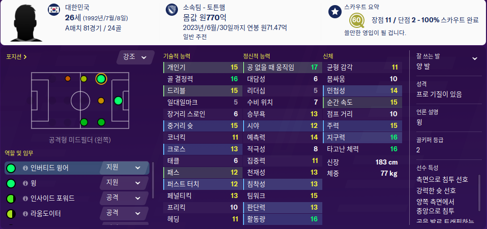 [FM 쿠보와 손흥민 일부 능력치 비교]