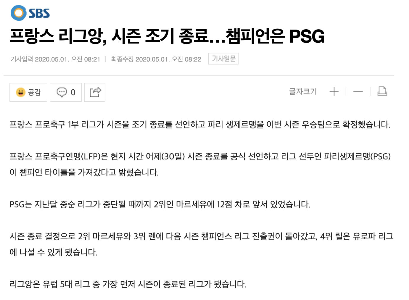 [프랑스 리그앙, 시즌 조기 종료.. 챔피언은 PSG]