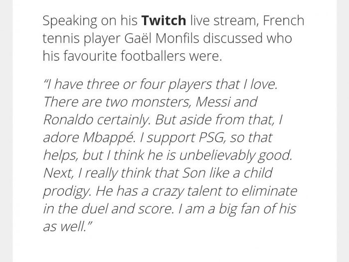 | 손흥민을 언급한 테니스선수 '가엘 몽피스' | |