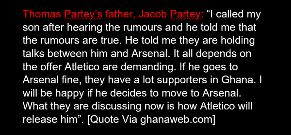 -파티 아버지 曰 "루머를 듣고 아들에게 전화했더니 아들이 루머가 진짜라고 말해줬습니다. 그는 아스날과 대화 중이라고 말했어요. 딜은 아틀레티코가 요구하는 오퍼에 따라 달렸습니다. 만약 아들이 아스날로 간다면 가나에는 아스날 팬들이 많아질겁니다. 저 또한 아들이 아스날로 이적한다면 기쁠거구요. 그들이 현재 논의 중인 것은 어떻게 아틀레티코가 그를 놓아줄지에 대한 것입니다"