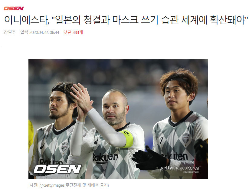 [이니에스타, "일본의 청결과 마스크 쓰기 습관 세계에 확산돼야"]
