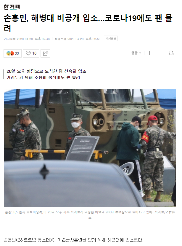 손흥민은 20일 오후 제주도 모슬포에 위치한 해병 제9여단 훈련소에 입소해 내달 8일까지 약 3주간 진행되는 기초군사훈련 첫날을 시작했다. 국내 취재진은 코로나19 탓에 ‘비공개 입소’를 선택한 손흥민이 이날 오후 1시 45분께 모습을 드러내지 않은 채 차를 타고 곧바로 훈련소로 들어갔다고 전했다.