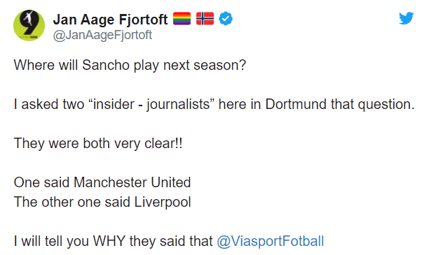 분데스리가 기자인 Jan Aage Fjortoft는 산초의 이적에 대해 도르트문트 내부 기자 2명과 이야기를 나눔. 기자 두 명 중 한 명은 맨유로 갈 것이라고 했고, 또 다른 한 명은 리버풀이라고 말함