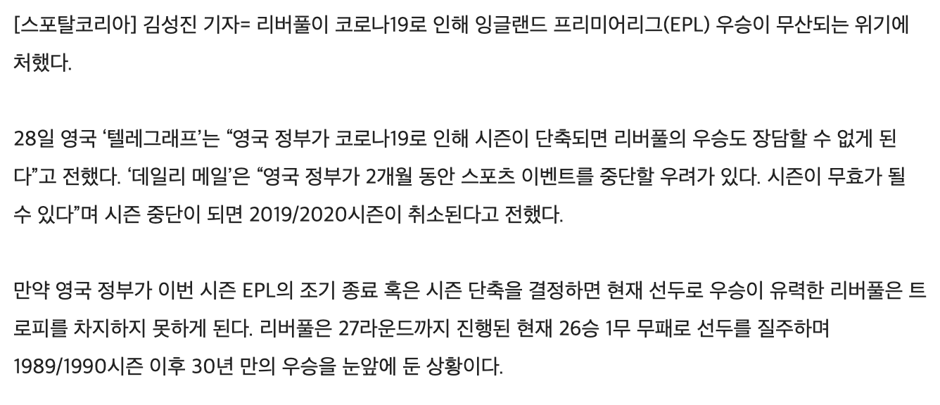 [리버풀, 코로나 19로 인해 우승 무효 위기설]