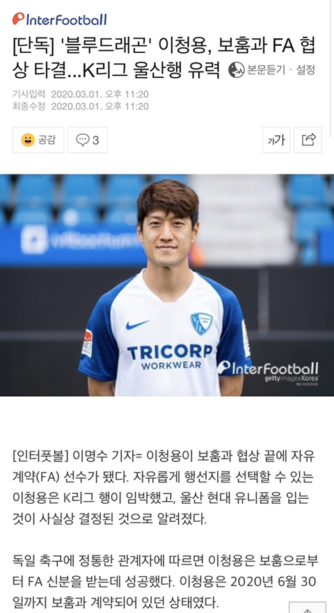 | [단독] '블루드래곤' 이청용, 보훔과 FA 협상 타결 울산행 유력 | |
