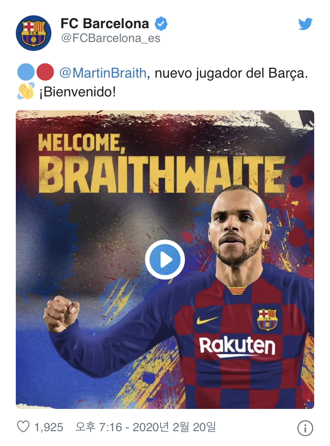 뎀벨레 선수의 부상으로 바르셀로나는 브라이스웨이트 선수를 영입하였습니다.