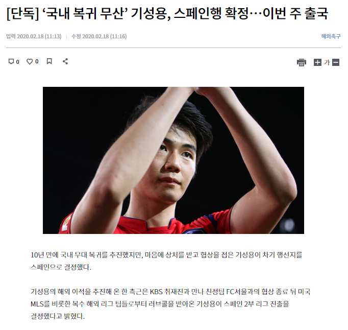 이 측근은 "기성용이 스페인 쪽으로 방향을 틀었다. 스페인 2부리그 팀이 기성용에게 올 시즌 잔여 3개월 만이라도 뛰는 단기 계약을 제시했다"고 밝혔다.