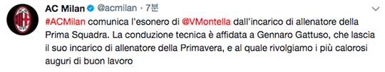 | [오피셜] 밀란, '성적 부진' 몬텔라 경질...후임 가투소 선임 | |