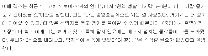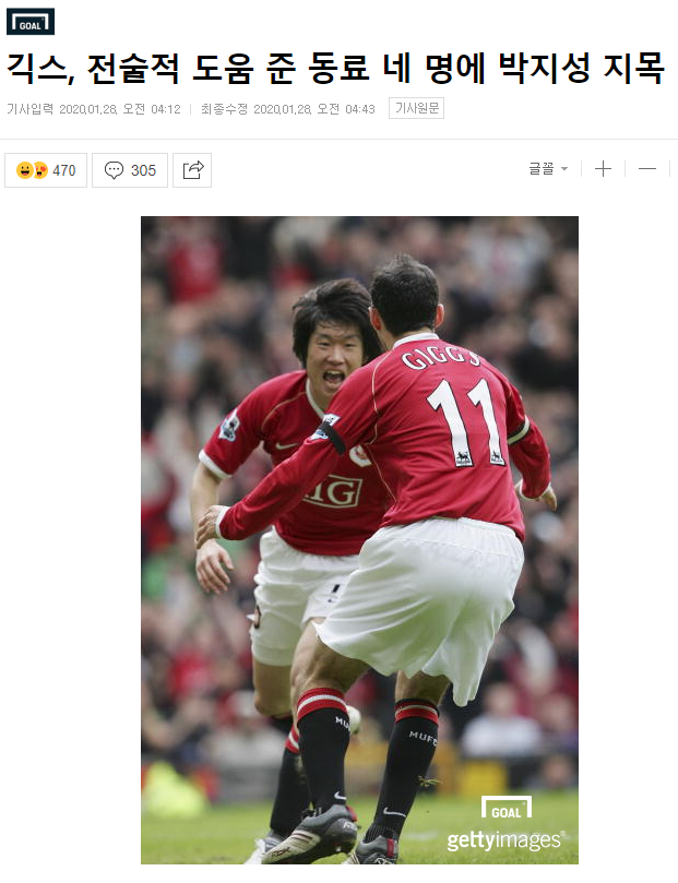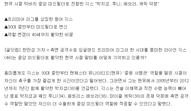 [긱스, 포지션 변경을 도와준 선수로 박지성 지목]