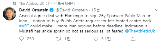 아스널은 플라멩구의 26살 파블로 마리 임대이적에 동의하였다. 아스널은 임대 후 파블로 마리와 계약할 수 있는 옵션도 포함했음.