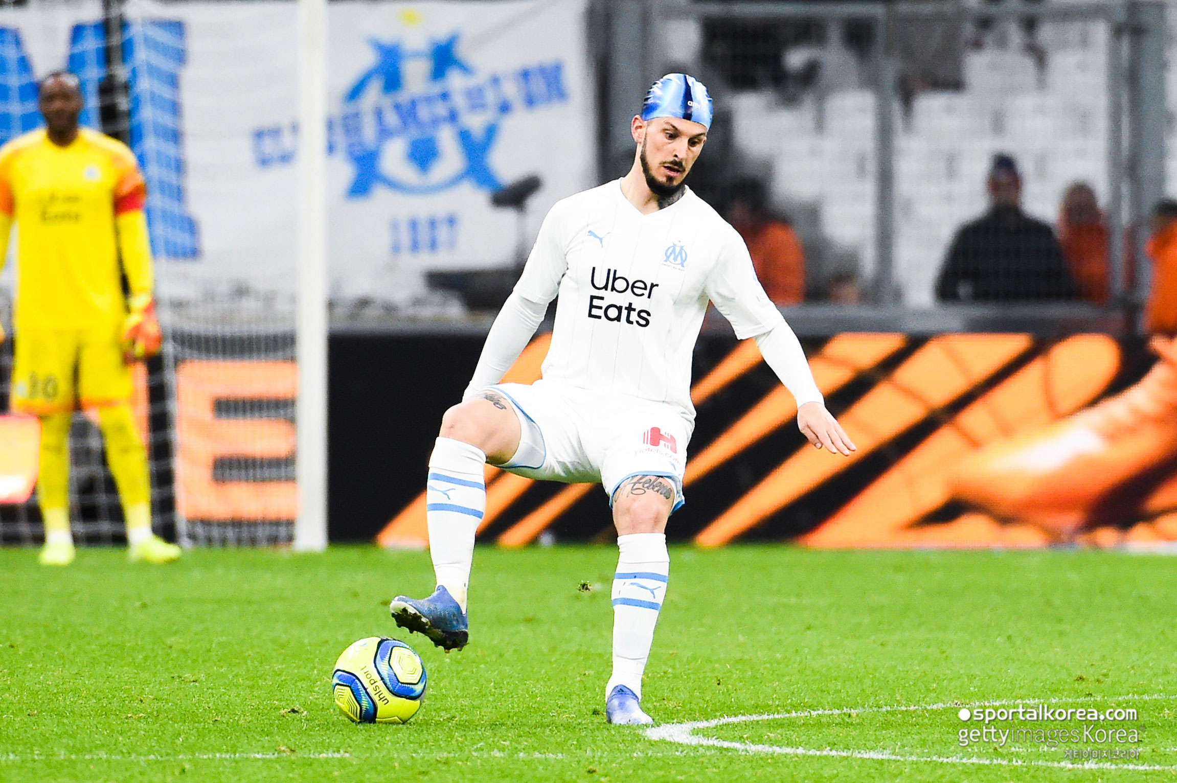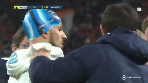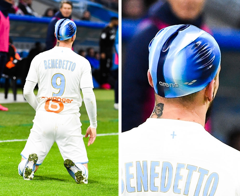 올림피크 드 마르세유 소속 ‘다리오 베네데토(Dario Benedetto)’ 선수는 머리에 수영모를 쓰고 경기를 뛰었습니다.