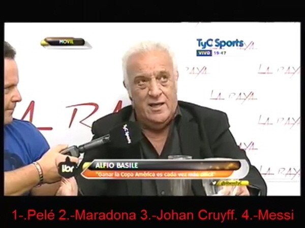 "메시는 현세대 최고의 선수지만 마라도나는 그 누구도 범접할 수 없는 전지전증한 존재이다. 이 전에도 이후에도 마라도나에 비견할 선수는 찾을 수 없다. 마라도나보다 우위에 있는건 펠레겠지. 나는 펠레, 마라도나, 크루이프, 메시 순으로 위대하다고 생각한다. 내가 생각하는 top 10에는 브라질 선수가 두 명 더 있는데, 그건 호마리우와 호나우두이다."