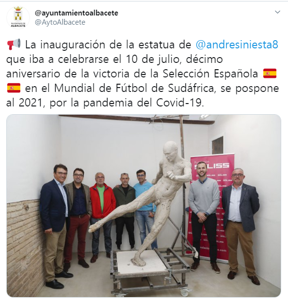 이니에스타의 고향인 알바세테에서 기획한 동상으로 월드컵 우승 10주년인 7월 11일에 공개할 예정이었으나 코로나 사태로 내년으로 연기...!! 사진은 청동 주조 단계 이전인 점토 스케치 단계에서 찍은 사진으로 최종 모습은 유니폼을 입은 모습일 것!!