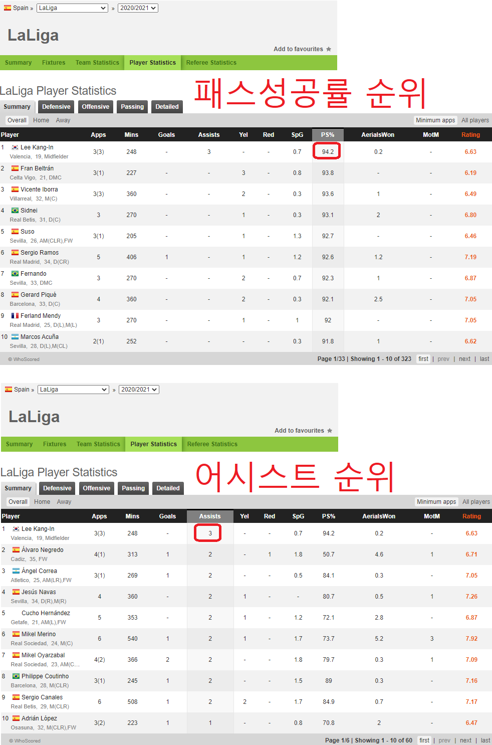 최소 경기(3경기) 충족한 323명 선수들중 라리가 패스성공률 1위 / 어시스트 1위