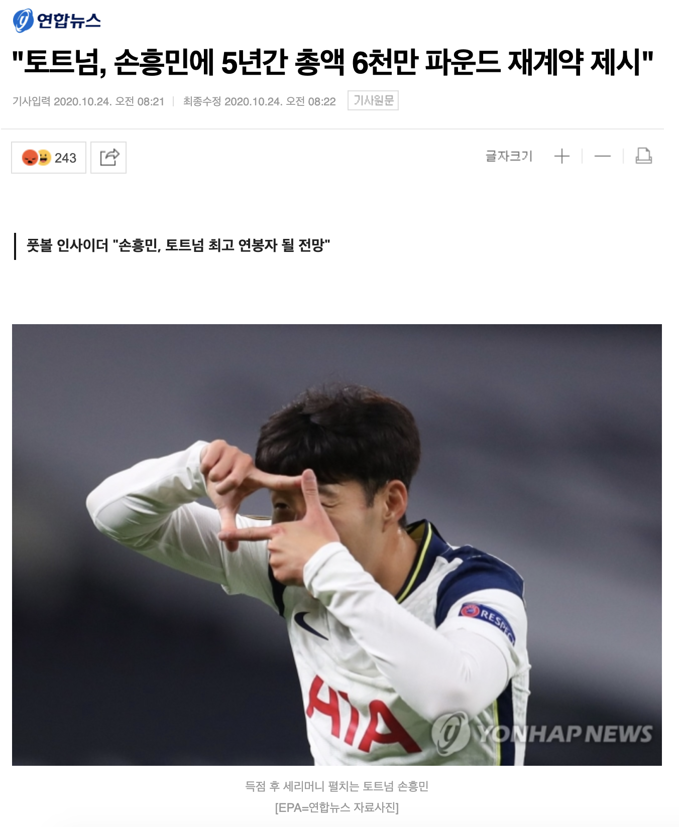 [토트넘, 손흥민에 5년간 총액 6천만 파운드 재계약 제시]