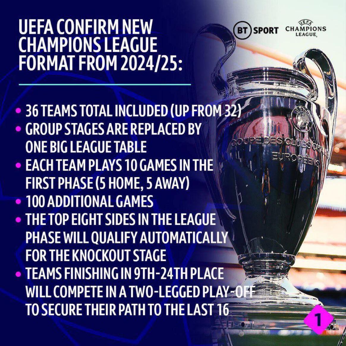 - 본선 참가팀 36팀으로 확대 - 추가 4팀은 다음과 같음 랭킹 5위리그(현 기준 리그앙)의 3위팀 챔피언스루트 예선 통과 1팀 *본선진출 실패팀 중 UEFA 팀 랭킹이 높은 2팀(현 기준 EPL 5, 6위인 토트넘, 맨유) - 조별예선이 아닌 하나의 테이블로 묶어 스위스 리그 스타일로 진행 - *본선 경기는 팀당 10경기 - 리그 1~8위팀은 16강 직행 / 9~24위 팀은 현재 유로파, 컨퍼런스처럼 넉아웃 라운드 진출