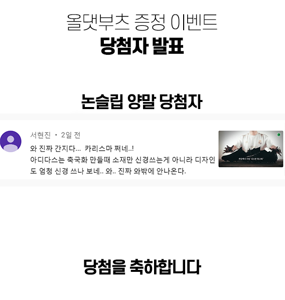 "올댓부츠의 양말 증정 이벤트는 이번 주에도 계속됩니다" 많은 참여 바랍니다! (※ 앞으로 매주 월요일마다 양말 당첨자를 발표할 예정입니다.)