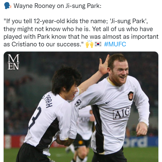 [웨인 루니 "박지성은 호날두 만큼 우리에게 중요했던 선수."]