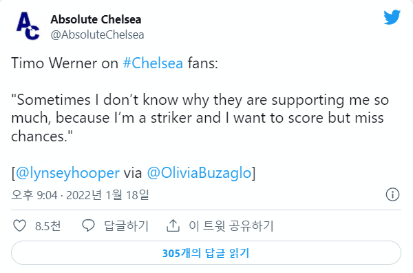 [베르너 : 첼시팬들이 왜 나를 응원해주시는지 모르겠다.]