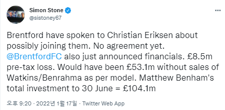 브렌트포드는 크리스티안 에릭센 영입을 고려중. 하지만 아직 협상은 없다.