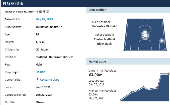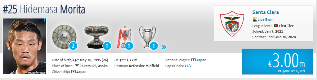 현재 포르투갈 리그 산타클라라 팀에서 활약중인 수비형 미드필더 '히데마사 모리타' 선수