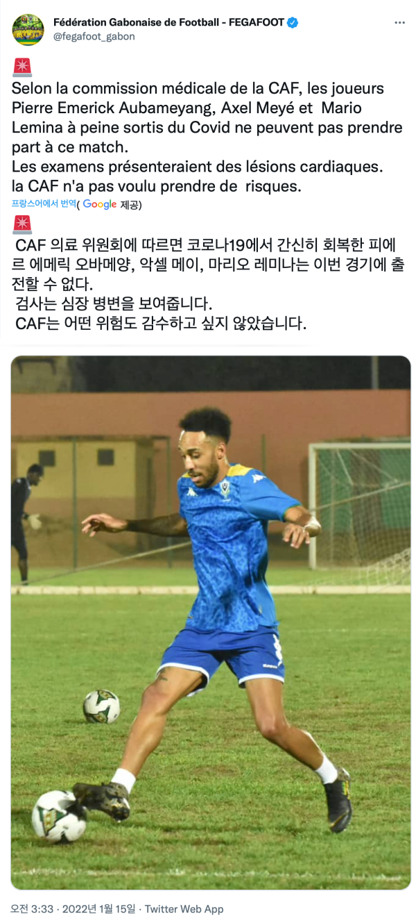 [오바메양은 '심장 문제'로 아프리카 네이션스컵에 출전 불가]