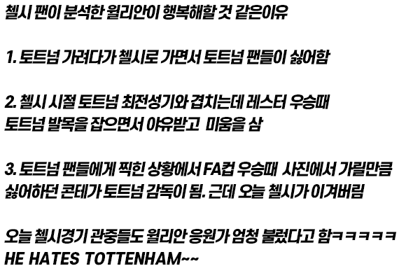 ㅋㅋㅋㅋㅋㅋㅋㅋ첼시를 사랑하는 이유보다 토트넘 과 콘테를 이겨서 좋아한듯??ㅋㅋㅋㅋㅋ