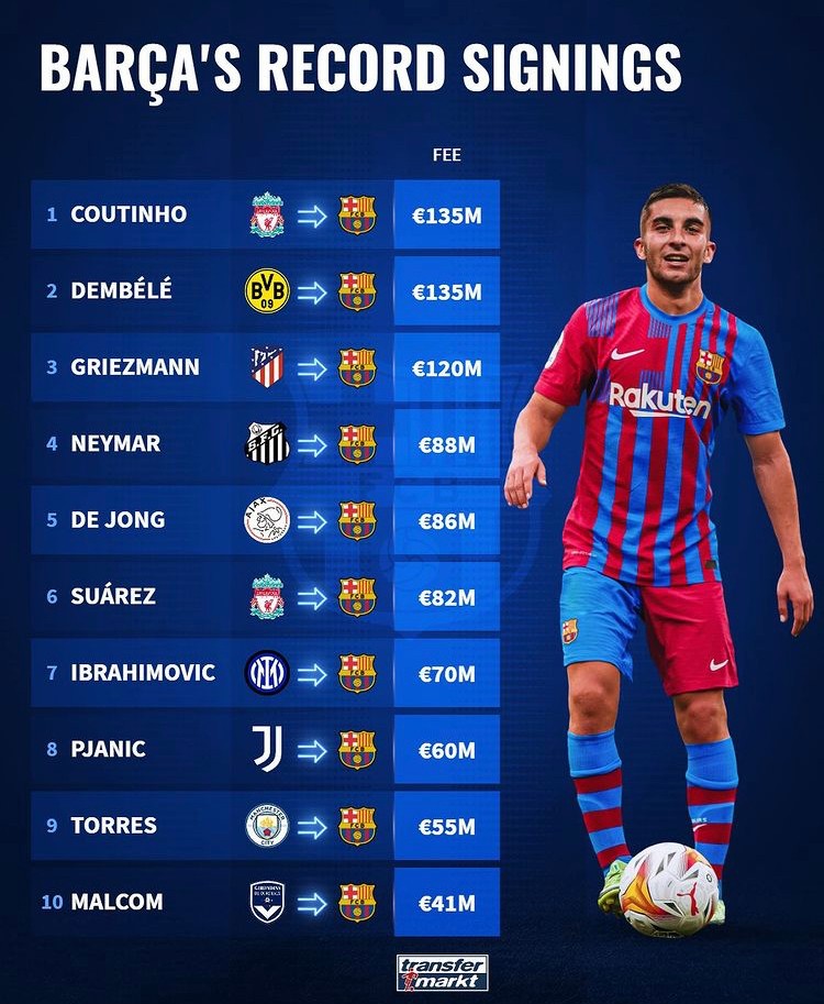 [안타까운.. 바르셀로나의 역대 영입 이적료 TOP 10]