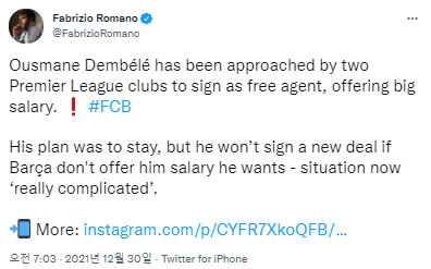 파브리지오 로마노 - EPL 2팀이 우스만 뎀벨레에게 FA로 높은 주급 제안을 함