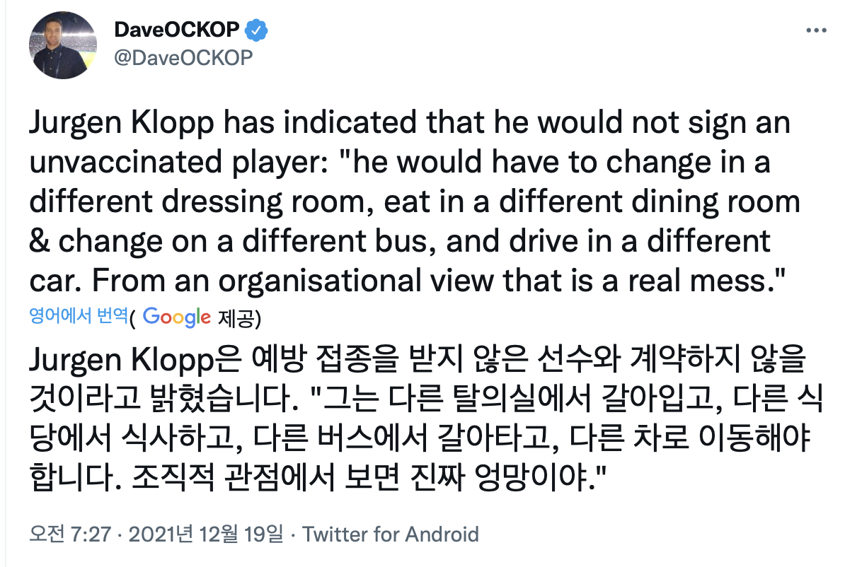 [클롭 "코로나 백신을 맞지 않은 선수는 OO 하지 않을 것!"]
